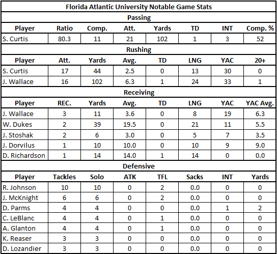 With roughly a minute left in the first quarter, Curtis setup the Owl offense to take advantage of the short field they received from the Lobo’s turnover. Curtis snapped the ball and checked it down to the to the left flat. CB Tim Foley flashed in front of the Owl wide receiver and was on his way for his first Division I career touchdown, a 64 yard return tying the game. FAU’s next offensive play, Curtis dropped back for a dump off screen pass to Wallace but failed to see CB Cranston Jones spying the back. Jones snatched the pass and returned it 41 yards for the second straight pick 6 for the Lobos. The defense had become the offense for the team.